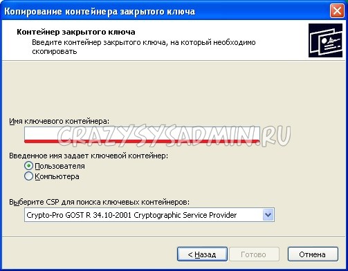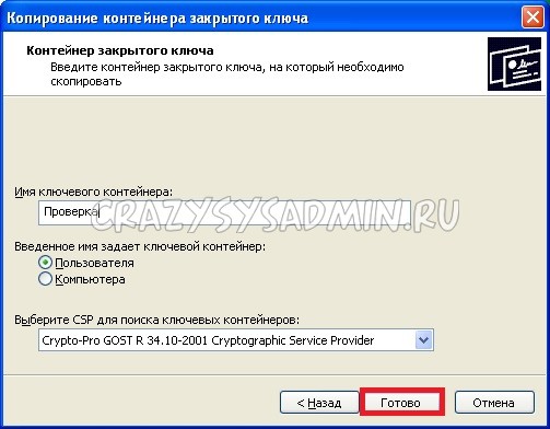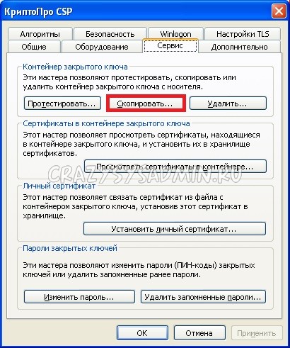 И там, в разделе под названием «Контейнер закрытого ключа», необходимо нажать на кнопку «Скопировать».