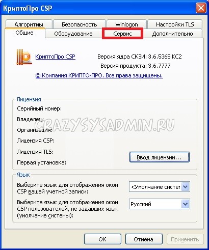 Далее, в открывшемся окне КриптоПро нужно перейти на вкладку «Сервис»: