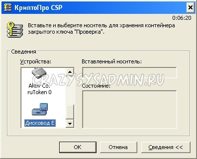 Если же, в качестве накопителя, на который копируется контейнер, выступает Rutoken или любой другой электронный идентификатор, то появится совсем другое сообщение, где будет запрошен pin-код от Rutoken (стандартный pin-код — 12345678):