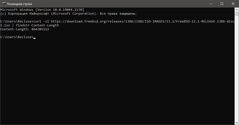 Для данной задачи, мы будем использовать утилиту cURL, которая есть по умолчанию в большинстве дистрибутивов Linux, Windows 10 и 11, и в других операционных системах. Она умеет работать с такими популярными протоколами как FTP, HTTP, HTTPS, TFTP и т. д. Ниже, в качестве примера, узнаем размер одного из iso образов FreeBSD, доступного по протоколу HTTPS.