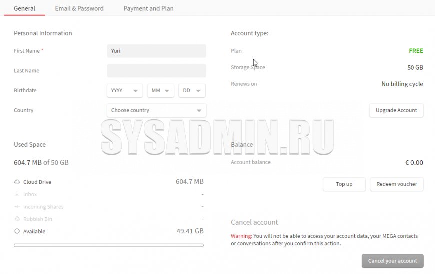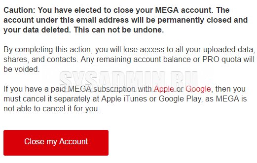 Удаление аккаунта на mega.nz