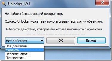 Дескриптор – это число, выполняющее роль адреса, по которому процесс обращается к открытому файлу. То бишь программа препятствий для удаления на этой стадии не видит. Выбирайте действие и нажимайте ”ОК”.