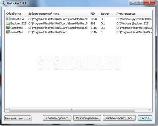 Я обычно выбираю ”удалить” и нажимаю “Разблокировать все”. Часто случается, что и процесс “explorer.exe” попадает в список блокираторов. Не волнуйтесь, если после нажатия “Разблокировать все” на несколько секунд останется только картинка на рабочем столе. Открытые вкладки проводника исчезнут, все остальное останется без изменений.