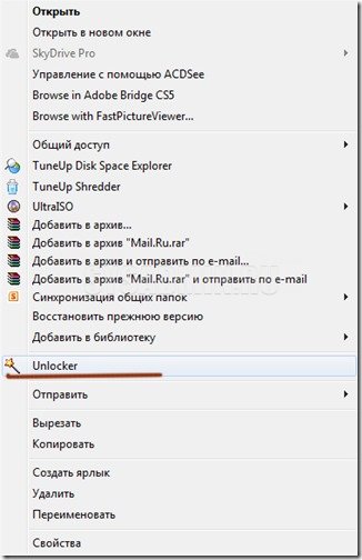 После установки программа встраивается в контекстное меню. Я показываю удаление на примере папки Mail.Ru с надоедливым до безобразия файлом GuardMailRu. Заходим в контекстное меню папки и выбираем “Unlocker”.