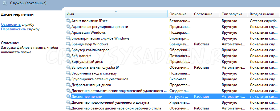 Далее, вне зависимости от результата на предыдущем шаге, идем в Службы, а именно ПускПанель управленияСистема и безопасностьАдминистрирование и запускам ярлык под названием «Службы» с правами администратора (правой кнопкой — запустить с правами администратора). В открывшемся окне ищем службу Диспетчер печати, выделяем её нажатием левой кнопкой мыши и в боковой колонке нажимаем на ссылку перезапустить.
