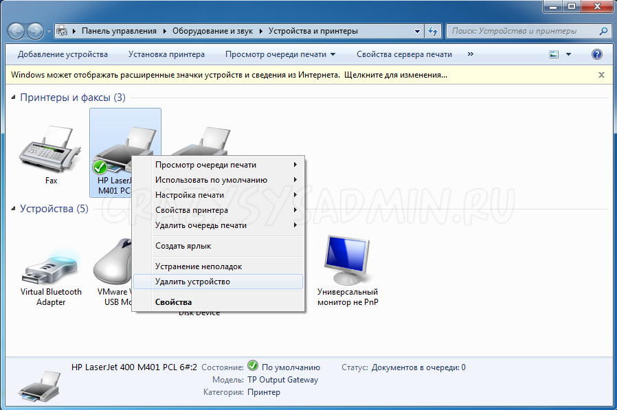 Приступим. Начнем с того, что попробуем удалить принтер стандартным способом. Идем в ПускПанель управленияОборудование и звукУстройства и принтеры нажимаем на проблемном принтере правой кнопкой мыши и выбираем в открывшемся меню Удалить устройство.