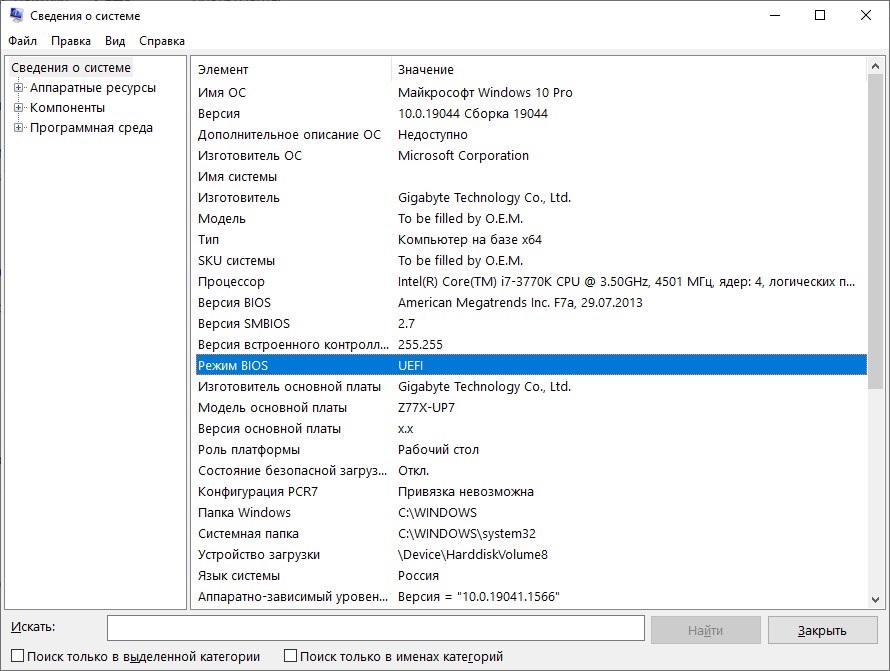 В открывшейся программе «Сведения о системе» можно будет найти строку «Режим BIOS». В случае, если операционная система запущена в обычном BIOS режиме, то там будет стоять значение Legacy. Если же система работает в UEFI режиме, то там так и будет написано — UEFI.