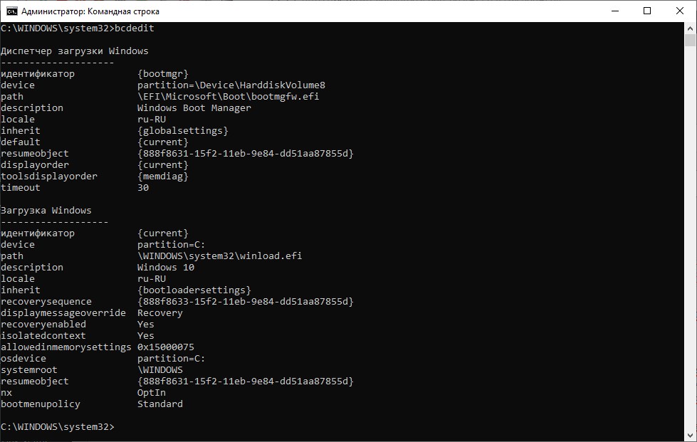 Другой способ посмотреть, в каком режиме работает операционная система, требует запуск командной строки от имени администратора. В ней нужно выполнить команду bcdedit. В появившемся выводе, стоит обратить внимание на строку «Path» — если там в конце присутствует расширение .efi, то значит операционная система работает в UEFI режиме.