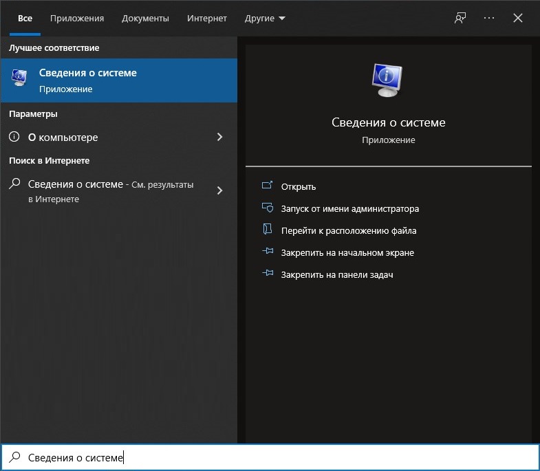 - В меню Пуск, набрать в поиске «Сведения о системе», и запустить высветившуюся в результатах поиска программу.