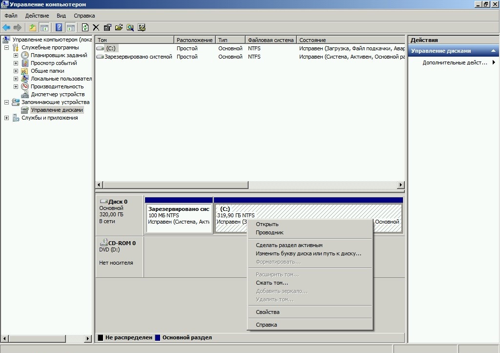 diskmgmt.msc, после чего нажать «ОК».Так же туда можно попасть, нажав правой кнопкой по значку «Компьютер», и выбрав пункт «Управление», и там в левой панели переключится на раздел «Управление дисками».