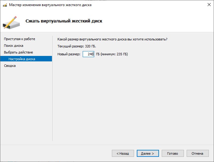 В некоторых случаях пункт «Сжать» может отсутствовать — например, весь объем виртуального жесткого диска занят файловой системой. По этому, необходимо выполнить действия, описанные в предыдущем разделе — «Предварительные действия». - Вводим новый размер жесткого диска и нажимаем «Далее». Обратите внимание, что сделать его меньше, чем указано в скобках не получится.