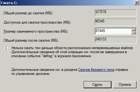 - Размер сжимаемого пространства (МБ) — сколько мегабайт будет «отобрано» у раздела