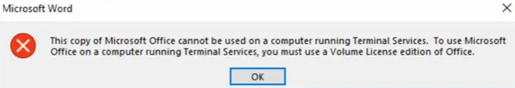 This copy of Microsoft Office cannot be used on a computer running Terminal Services. To use Office on a computer running Terminal Services, you must use a Volume License of Office.