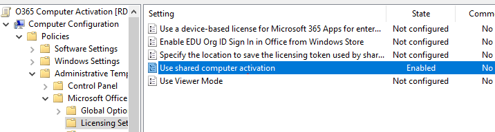 Либо включить отдельный параметр групповой политики Use shared computer activation из административных шаблонов GPO для Office в секции. Computer Configuration -> Administrative Templates -> Microsoft Office 2016 (Computer) –> License Settings.