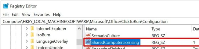 Если вы установили Office 365 без опции SharedComputerLicensing в XML файле, то чтобы целиком переставлять пакет, можно изменить тип установки Office365 из реестра. Для этого в ветке реестра HKEY_LOCAL_MACHINESOFTWAREMicrosoftOfficeClickToRunConfiguration нужно изменить значение Reg_SZ параметра SharedComputerLicensing на 1.