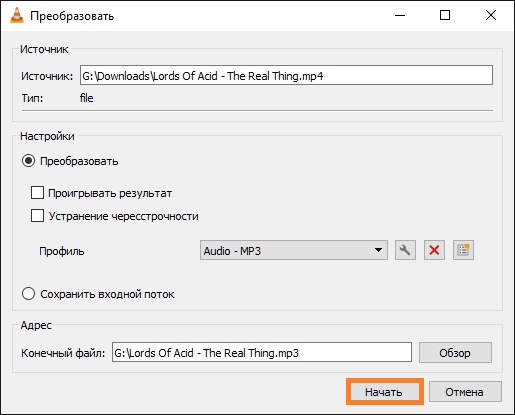 - После этого, остается только нажать на кнопку «Начать«, и получить сконвертированное видео в аудио.