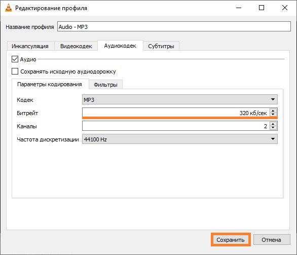 - Перейдя на неё, ставим нужный битрейт (по умолчанию стоит 128 кбит/сек), меняем еще какие-либо необходимые настройки, и нажимаем на кнопку «Сохранить«.