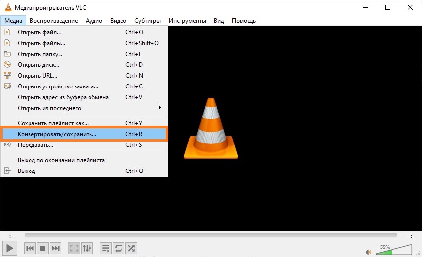 - Открываем VLC media player. Нажимаем «Медиа — Конвертировать/сохранить…» (или просто нажимаем клавиши Ctrl + R).