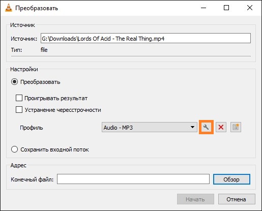 - Теперь, в самом низу, где находится раздел «Адрес» и «Конечный файл«, указываем место, куда нужно сохранить получившийся файл, нажав на кнопку «Обзор«