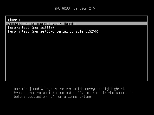 - В меню загрузчика Grub, выбираем пункт «Дополнительные параметры для …«.