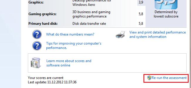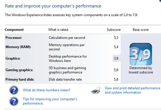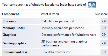 Текущие значение индекса производительности (Windows Experience Index) можно посмотреть в окне свойств системы (Computer->Properties)