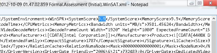<DiskScore> — тег оценки производительности жесткого диска - Просто найдите соответствующий тег и измените значение, которое он содержит, на нужное вам. Сделаем общий индекс производительности компьютера 9.9 баллов