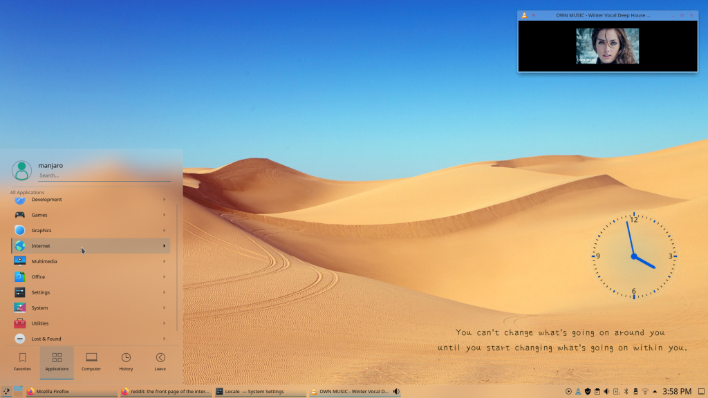Нейтральная «стеклянная» тема от дизайнера L4k1. Панель, меню, рамки окон и виджеты здесь полупрозрачные, поэтому приобретают оттенок обоев. Автор предлагает на выбор три варианта иконок: с эффектом стекла, светлые и хамелеоны. Из дополнительных опций — экранная заставка и фон для экрана авторизации.