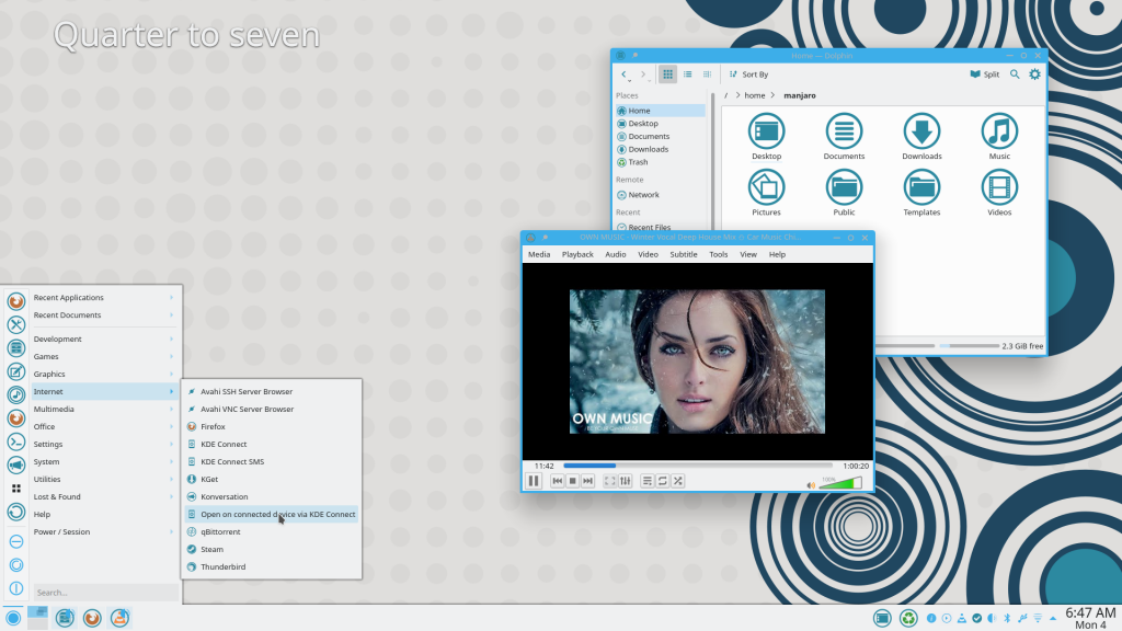 Тема KDE с боковой панелью, частично имитирующая интерфейс Ubuntu. Подложка меню и окон выполнена в стиле матового стекла. Основные цвета – тёмно-серый и чёрный. Иконки и обои в наборе отсутствуют. Дизайн оптимизирован для работы с окнами, развёрнутыми на весь экран. Тема отлично подойдёт тем, кто хочет сконцентрироваться на выполнении ежедневных задач и не отвлекаться на разнообразные «украшения». Разработчик – phob1an .