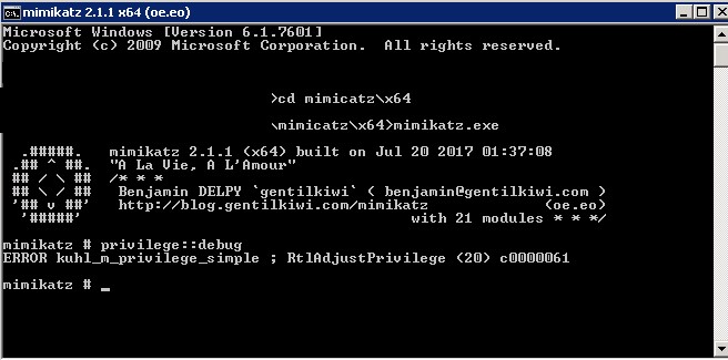 EROOR kuhl_m_privilege_simple ; RtlAdjustPrivilege (20) c0000061