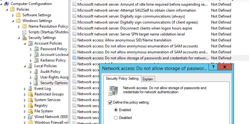 Для этого включите политику Network access: Do not allow storage of passwords and credentials for network authentication в разделе Computer Configuration -> Windows Settings ->Security Settings ->Local Policies ->Security Options.