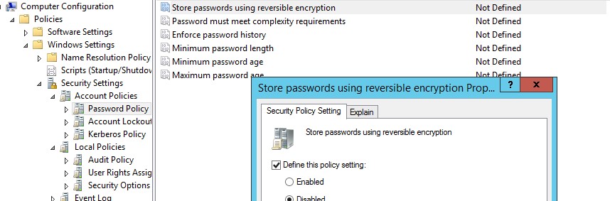 Следует явно запретить хранить пароли пользователей в AD в текстовом виде. Для этого следует включить доменную политику Store password using reversible encryption for all users in the domain в разделе Computer Configuration -> Windows Settings ->Security Settings -> Account Policies -> Password Policy, выставив ее значание на Disabled.