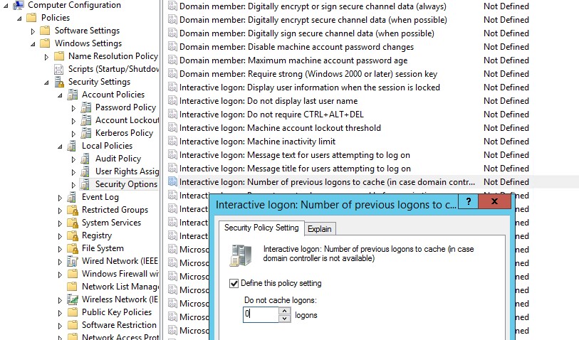 Желательно запретить использование сохранения кэшированных данных пользователя для входа с помощью включения политики Interactive Logon: Number of previous logons to cache (in case domain controller is not available) в разделе Computer Configuration -> Windows Settings -> Local Policy -> Security Options, изменив значение ее параметра на 0.