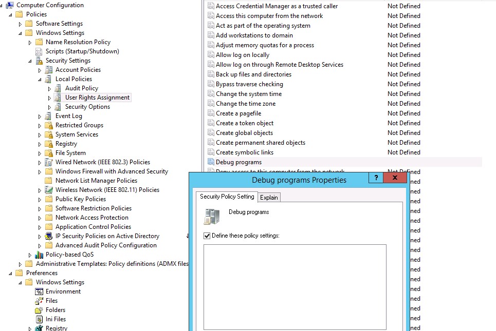 По умолчанию, права на использование режима debug предоставляются локальной группе администраторов (BUILTINAdministrators). Хотя в 99% случаях эта привилегия абсолютно не используется администраторами (нужна она как правило системным программистам), соответственно, в целях безопасности возможность использования привелегии SeDebugPrivilege лучше отключить. Делается это через групповую политику (локальную или доменную). Перейдите в раздел Computer Configuration -> Windows Settings -> Security Settings -> Local Policies -> User Rights Assignment и включите политику Debug Program. В нее нужно добавить доменную группу пользователей, которым могут понадобится права debug (как правило, разработчики), либо оставить эту группу пустой, чтобы данного права не было не у кого.