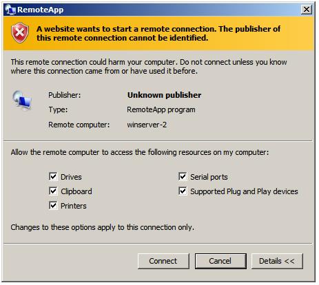 В этом случае, так же как при использовании TS Web Access, пользователь будет предоставлена возможность указать, какие локальные ресурсы, такие как диски, порты и принтеры должны быть доступными в удаленном приложении.
