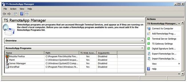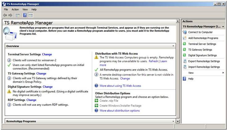 Процесс настройки RemoteApps осуществляется с использованием утилиты TS RemoteApp Manager. Его можно запустить из меню Пуск -> Все программы -> Terminal Services -> TS Remote App Manager, либо с помощью оснастки remoteprograms.msc. После запуска, интерфейс менеджера будет выглядеть примерно следующим образом: