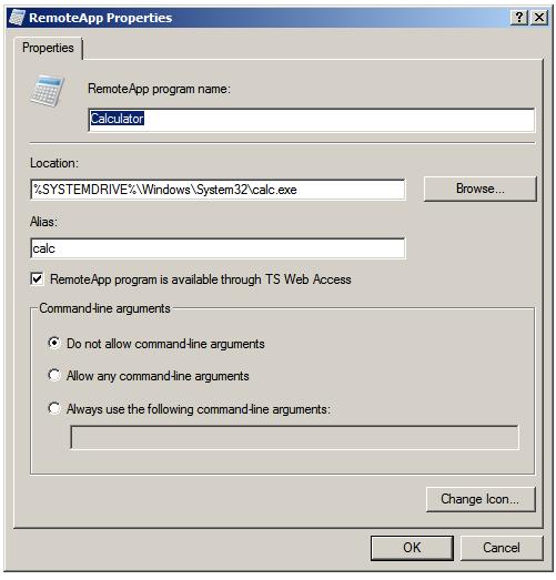 Также с помощью этого мастера можно настроить различные свойства для каждого приложения, доступ к этим настройкам можно получить с помощью кнопки Properties. Окно настройки параметров RemoteApp показано ниже.