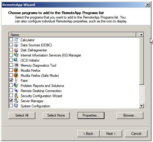 Для настройки приложения в качестве RemoteApp, необходимо нажать ссылку Add RemoteApp Programs в панели Actions, расположенной в правом верхнем углу экрана менеджера RemoteApp Manager. На экране появится мастер RemoteApp, содержащий список установленных в системе приложений. Вам необходимо отметить галочками одно или несколько приложений, и нажать Next.