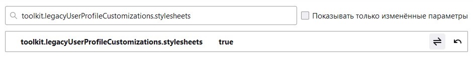 Затем, используя окно поиска, находим toolkit.legacyUserProfileCustomizations.stylesheets и путем двойного клика, переключаем его значение с false на true.