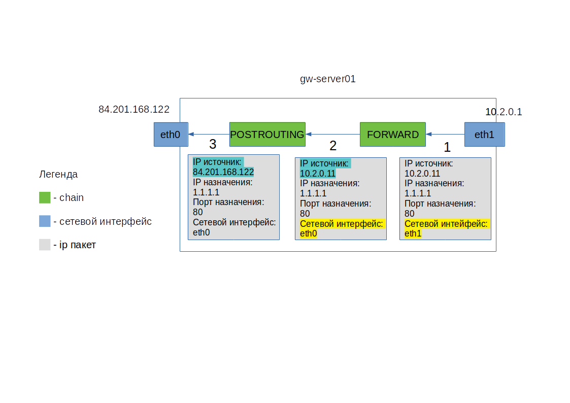 - В конце IP пакет проходит цепочку POSTROUTING, в которой происходит подмена IP адреса источника, на IP адрес внешнего интерфейса eth0 сервера gw-server01