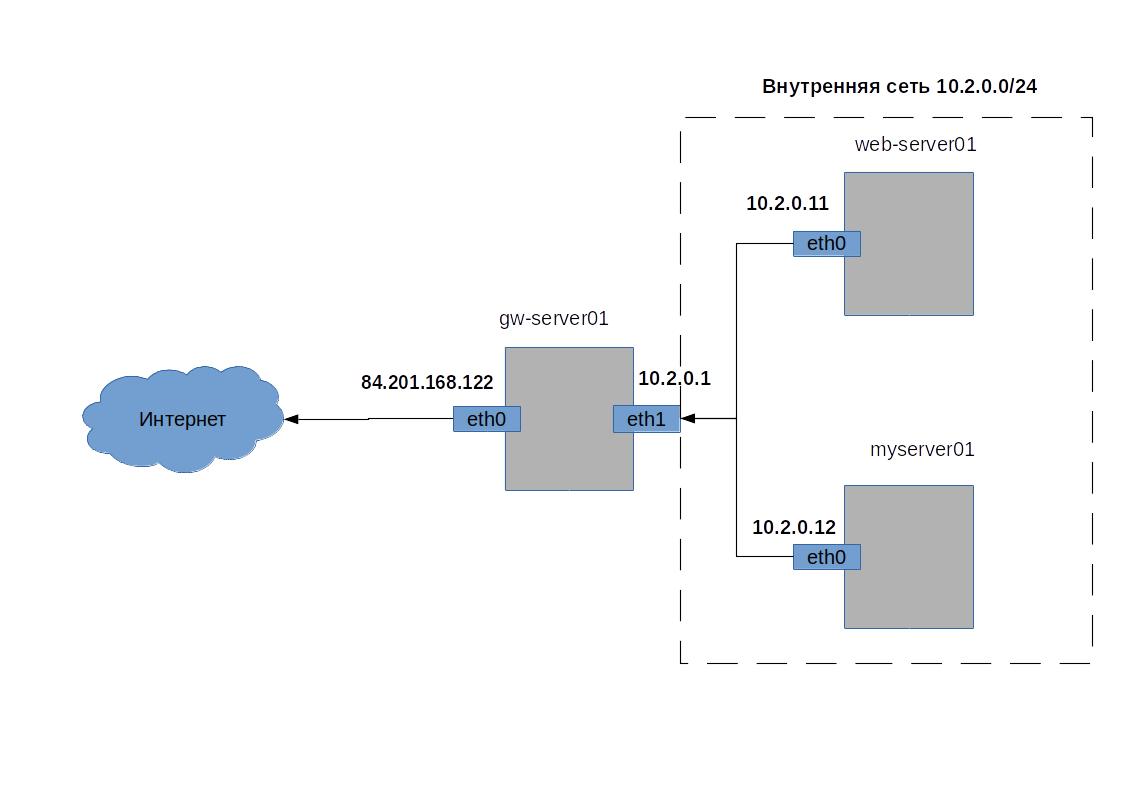 - gw-server – сервер шлюз, т.е. наш CentOS Linux сервер, который предоставляет доступ за пределы внутренней сети. У него два интерфейса, первый eth1(10.2.0.1) во внутренней сети, второй eth0(84.201.168.122) с публичным IP адресом и доступом в Интернет;
