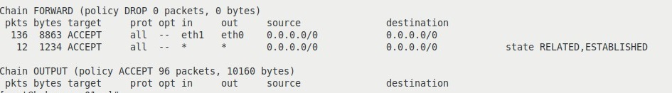 Создадим правило в iptables, разрешающее передачу пакетов между внутренним (eth1) и внешним (eth0) интерфейсом: