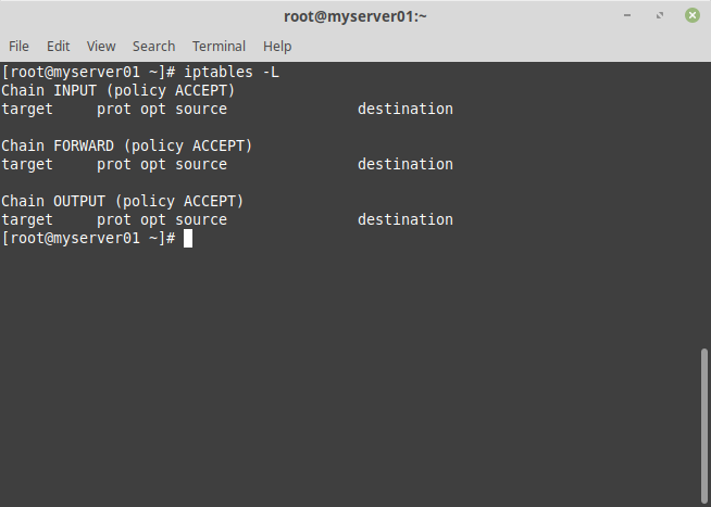 Например, результат команды iptables -L, когда в таблицах еще не создано правил: