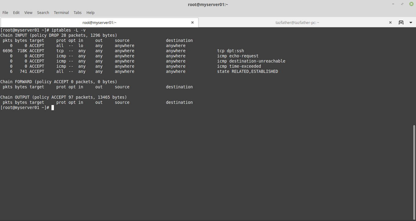 Посмотрим на результатурующую таблицу правил iptables, добавим ключ -v, чтобы показать более подробный вывод: