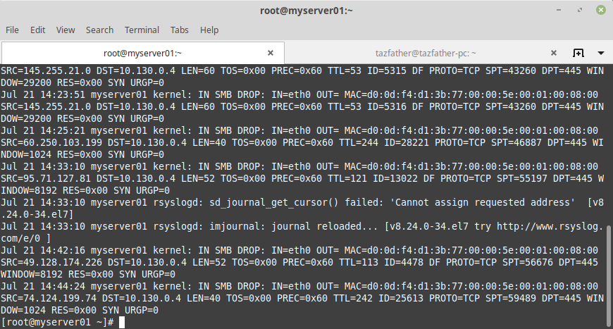 здесь —log-prefix задает префикс для всех сообщений, логируемых нашим правилом. Это удобно, если у вас несколько разных правил логирования, или для дальнейшей программной обработки. Если теперь попробовать подключиться снаружи к нашему серверу на порт 445, например через telnet, в файле /var/log/messages появятся записи: