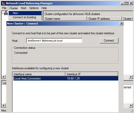 Откройте консоль управления Network Load Balancing Manager, щелкните по Network Load Balancing Clusters, и выберите создать новый кластер New Cluster. Чтобы подключится к серверу, который должен стать членом нового кластера, в окне Hostвведите имя или адрес хоста и щелкните Connect. Выберите сетевой интерфейс, который вы хотите задействовать под кластер и потом нажмите Next.