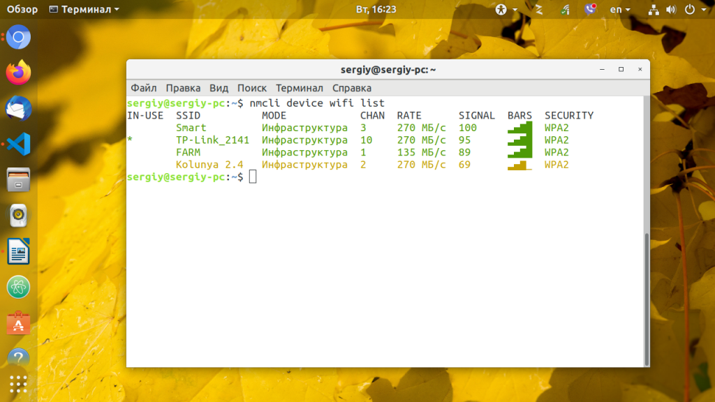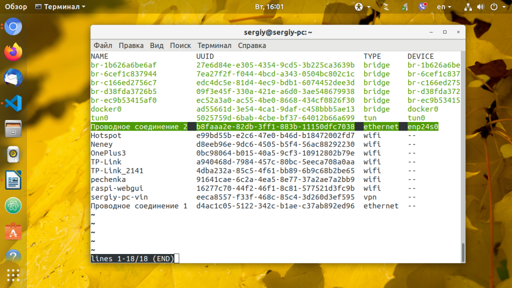 Теперь самое интересное, управление сетью nmcli. Смотрим список доступных подключений: