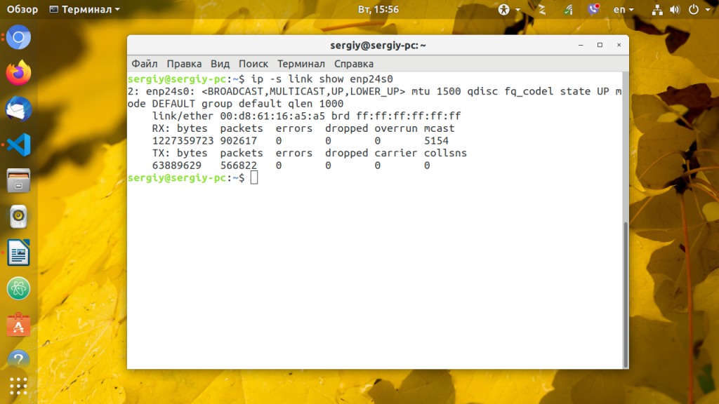 Для просмотра статистики переданных и полученных пакетов для интерфейса, например, enp24s0, наберите:
