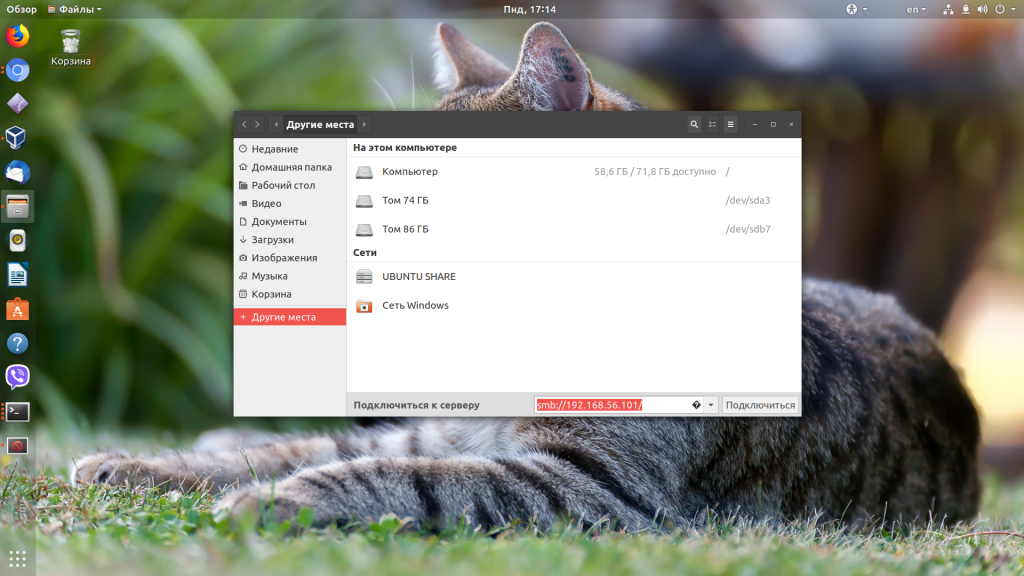 Также вы можете подключится к этому серверу из Linux с помощью Nautilus для этого достаточно набрать адрес smb://ip-сервера, в разделе другие места: