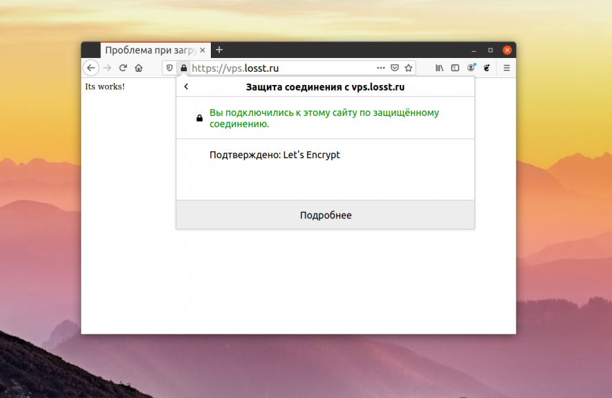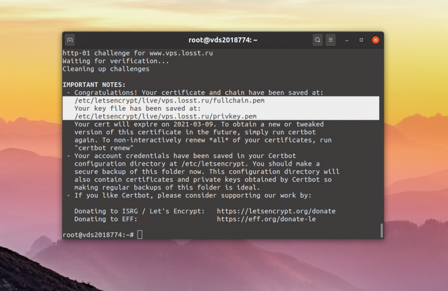Здесь программа сообщает о том, что файлы сертификата SSL Nginx сохранены в каталоге /etc/letsencrypt/live/vps.losst.pro/. Теперь настройка SSL Nginx.