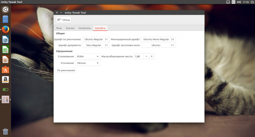 Если вы раньше пользовались Gnome 3, то знаете, что там есть такая возможность, как масштабирование шрифтов и выбор шрифта для системы с помощью Gnome Tweak Tool. Утилита Unity Tweak Tool тоже так умеет. Запустите ее и откройте пункт «Шрифты»: